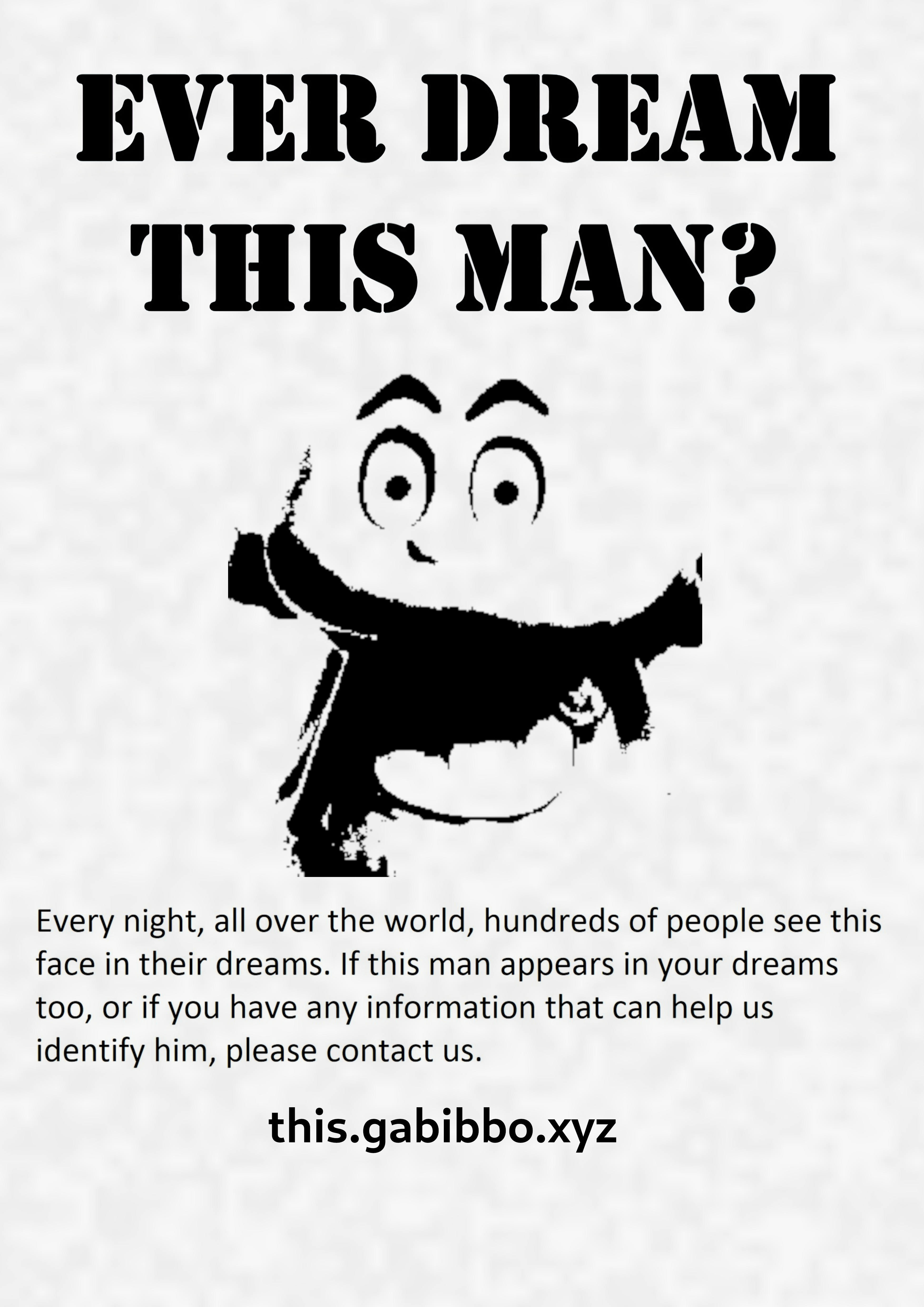 From September 2019 until today, at least800069.000 people have claimed they have seen this gabibbo in their dreams, in many cities all over Italy: Turin, Florence, Ancona, Trento, Quinto di Treviso, Catanzaro, Bologna, Livorno, Cernusco sul Naviglio, Over a bridge in Naples, Inside the bathrooms of "La Sapienza" in Rome, etc.